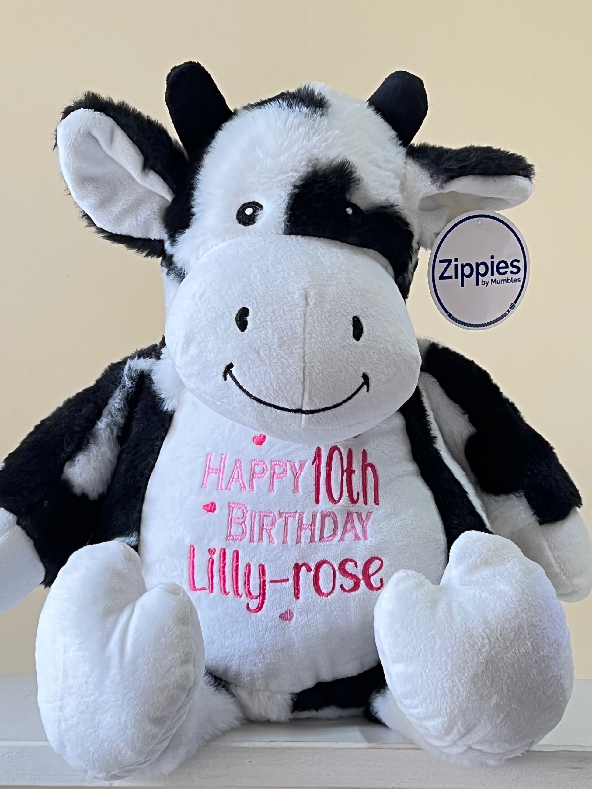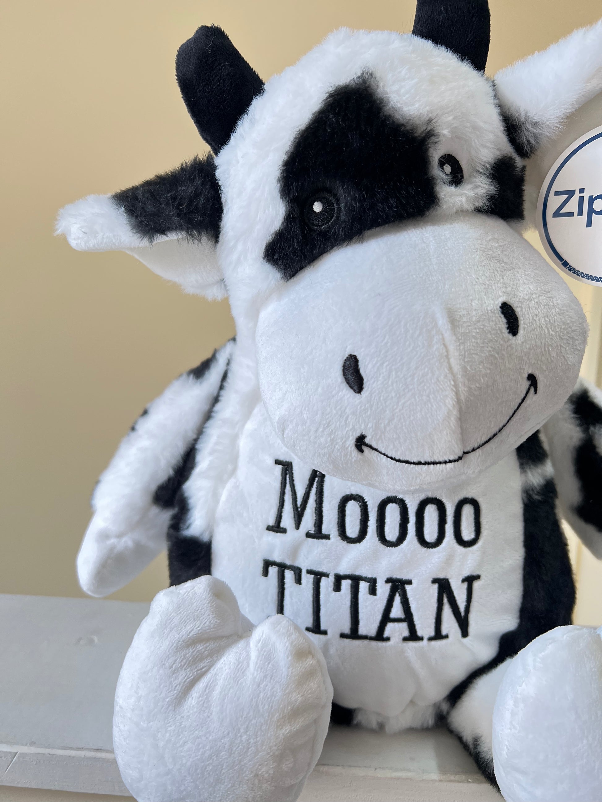 Personalised Embroidered Black & White Cow Teddy – Name, Birth Block or Custom Message | 48cm