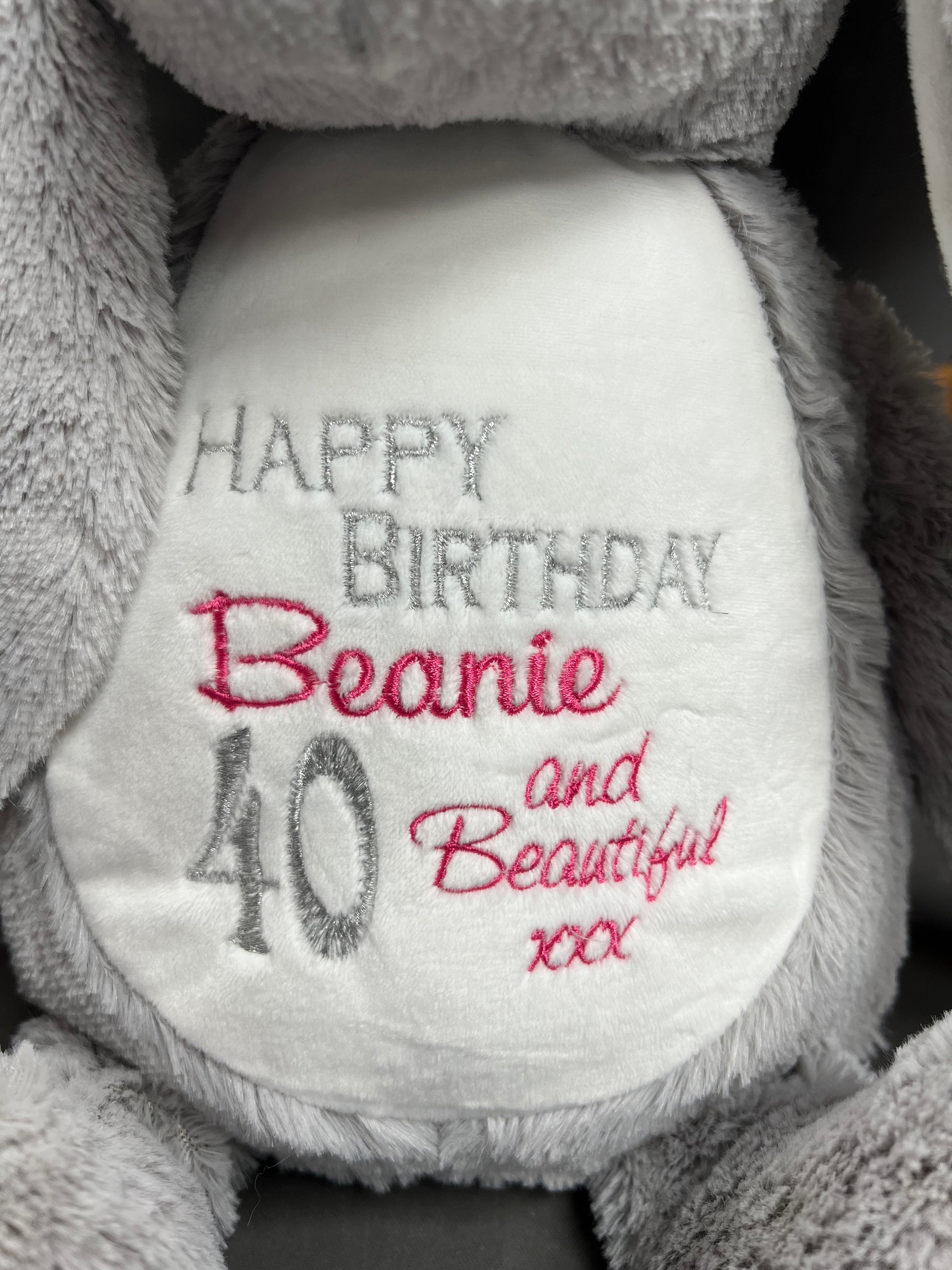 Welcome a new baby or mark a precious moment with our Personalised Embroidered Grey Bunny Teddy – a timeless keepsake made with love and care. This soft, floppy-eared bunny is the perfect gift for newborns, baby showers, birthdays, or christenings, and can be personalised with an embroidered name, birth details, or a meaningful message.