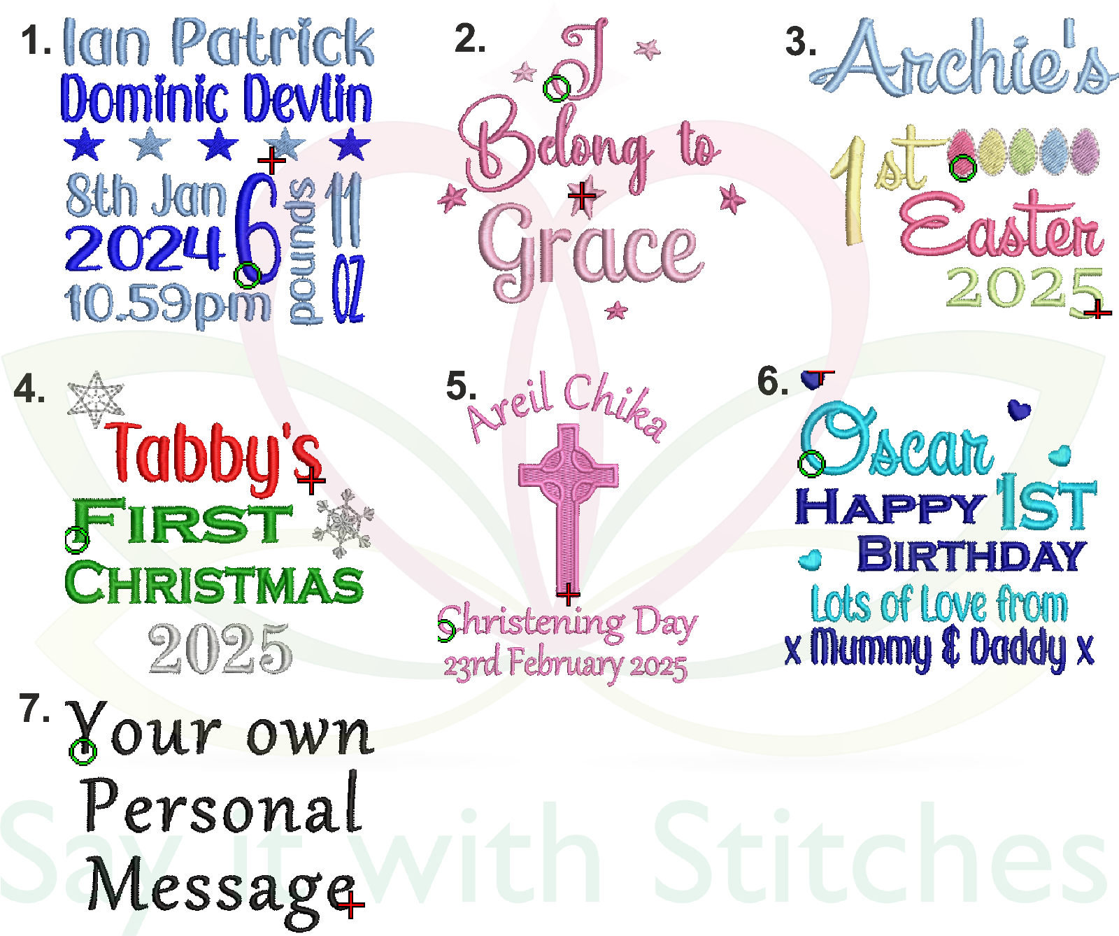 The bunny’s tummy is embroidered to your exact specifications. Choose a birth block to display baby’s full birth details, or keep it simple with a name-only or "I belong to" design. You can also opt for birthday, christening, or seasonal messages. We offer a range of thread colours and can add sweet motifs such as hearts, stars, footprints, or handprints to make your bunny truly one of a kind.